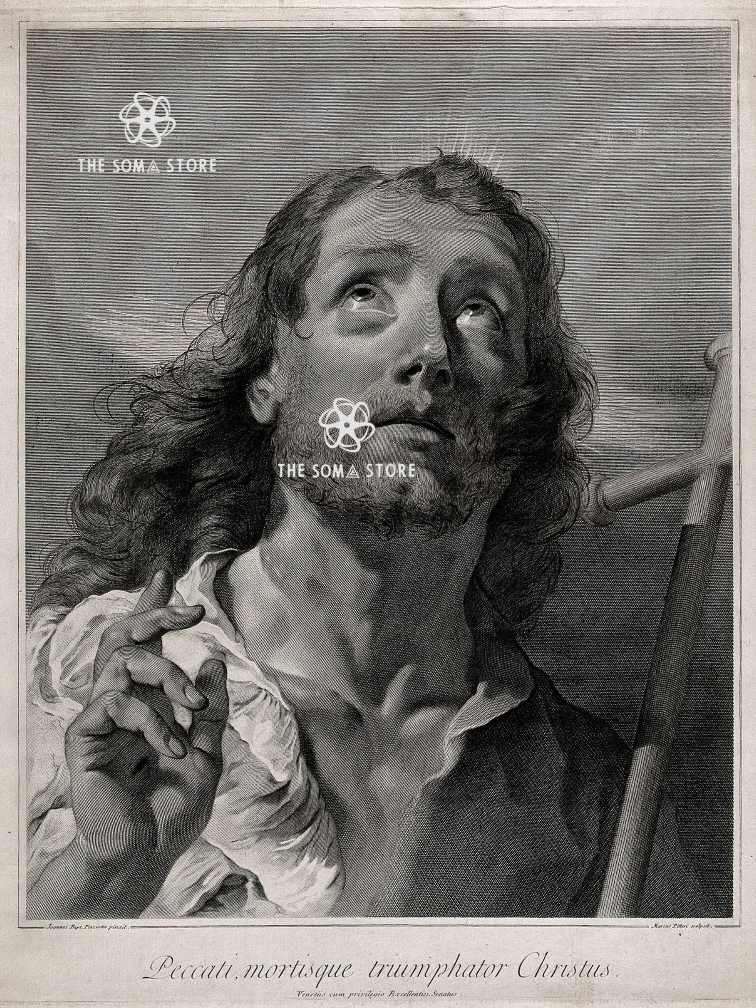 This powerful engraving presents Jesus Christ as the Redeemer, a deeply devotional image reflecting the central Christian belief that Christ conquered sin and death through his sacrifice. The inscription beneath the image reads “Peccati, mortisque triumphator Christus”, meaning “Christ, the conqueror of sin and death.”