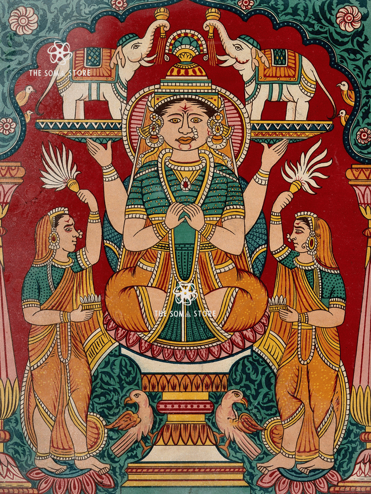 This chromolithograph depicts Gaja Lakṣmī, the majestic form of the goddess Lakṣmī being ceremonially anointed by two elephants. This iconography represents royal abundance, fertility, rain, and cosmic order, where prosperity flows as a sacred force rather than mere wealth.