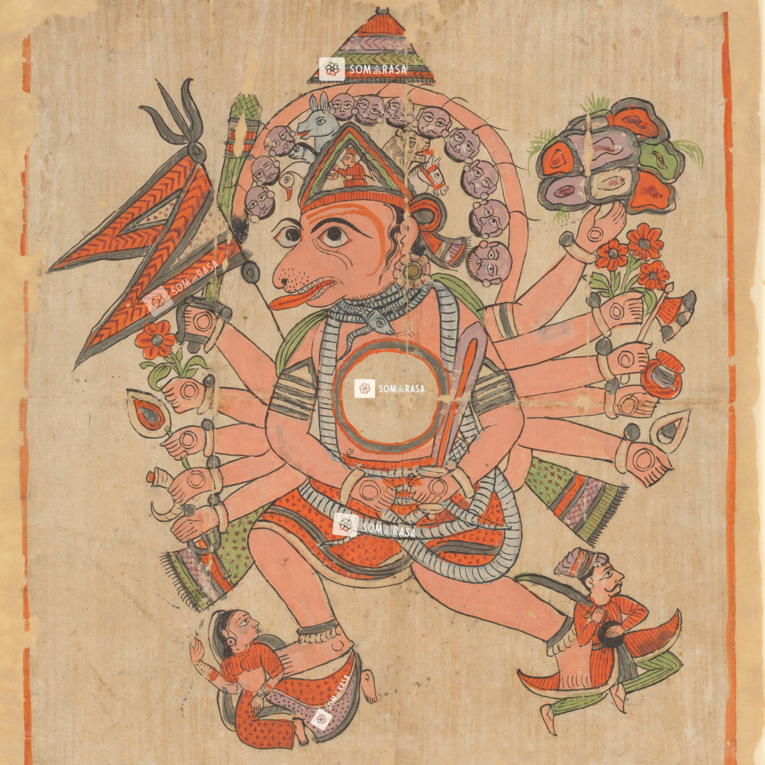 This boldly coloured folk-Tantric painting presents Hanuman not merely as Rāma’s devoted servant but as a cosmic guardian. In this rare Pañcha-Mukha (Five-Faced) manifestation, he appears with the heads of: