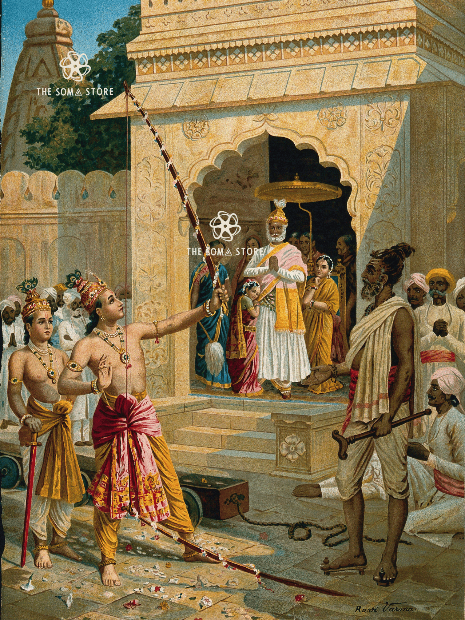 The setting reflects the grandeur of a royal court, with ornate architecture and richly dressed spectators witnessing the extraordinary event. Ravi Varma’s detailed composition transforms the epic narrative into a vivid moment of triumph and destiny.