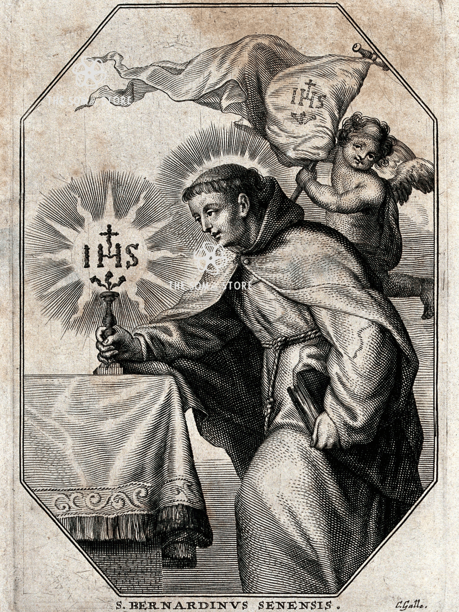 This striking devotional engraving portrays Saint Bernardino of Siena, one of the most influential Franciscan preachers of the 15th century. The artwork highlights the saint’s deep devotion to the Holy Name of Jesus, symbolized by the radiant monogram “IHS”, which became closely associated with his ministry.