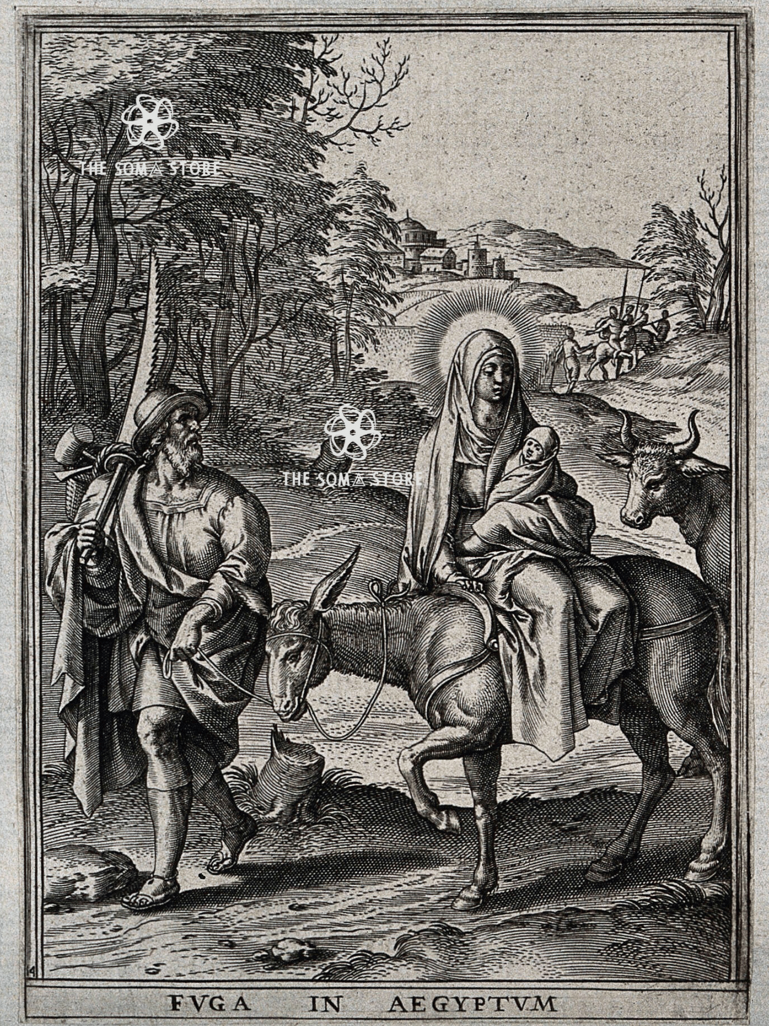 This finely detailed engraving depicts the sacred journey known as The Flight into Egypt, one of the earliest episodes in the life of Jesus Christ. The scene illustrates the moment described in the Gospel of Matthew (2:13–15), when Joseph is warned by an angel to take Mary and the infant Jesus and flee to Egypt to escape the persecution of King Herod.